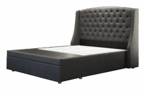 Wingback luxe, tidy storage. Miramar is an upholstered bed frame in charcoal grey with a button tufted winged headboard and a pre-assembled 2 drawer foot end — premium look, sharp value.